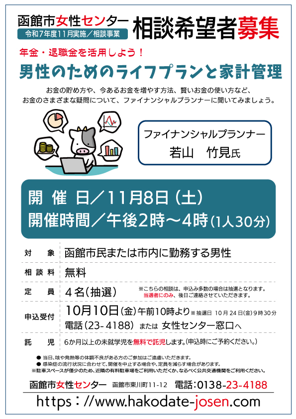 【申込受付】10月10日(金)午前10時より 電話(0138-23-4188)または女性センター窓口へ